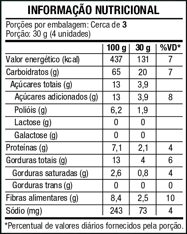 Farinha de trigo integral, farinha de trigo especial enriquecida com ferro e ácido fólico, óleos vegetais (soja, milhoe algodão), açúcar mascavo, féculade mandioca, extrato de malte, cacau em pó, fibra de polidextrose, gotas de cobertura sabor chocolate meio amargo zero lactose, farinha de arroz, sal, edulcorantes xarope de maltitol e sucralose, fermentos químicos bicarbonato de sódio, bicarbonato de amônio, pirofosfato ácido de sódio e fosfato monocálcico, emulsificante lecitina de soja,acidulante ácido cítrico e aromas.