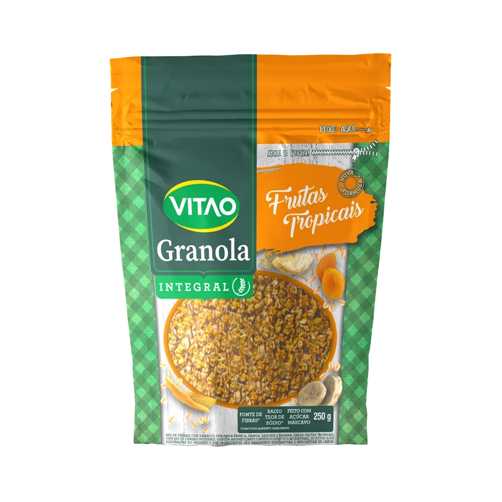 A granola integral tradicional frutas tropicais da Vitao 250g é uma escolha deliciosa e saudável para o café da manhã ou lanche. Feita com ingredientes integrais selecionados, como flocos de cereais, sementes e frutas desidratadas, ela oferece uma combinação perfeita de crocância e o sabor exótico das frutas tropicais. Adoçada com açúcar mascavo, um adoçante natural que proporciona um leve sabor caramelizado, essa granola é rica em fibras, vitaminas e minerais, garantindo energia sustentada e auxiliando na digestão saudável. Versátil, pode ser consumida pura, com iogurte, frutas, ou até mesmo em receitas como bolos e muffins. Desfrute de uma experiência de sabor nutritiva e natural com a granola integral tradicional frutas tropicais da Vitao.