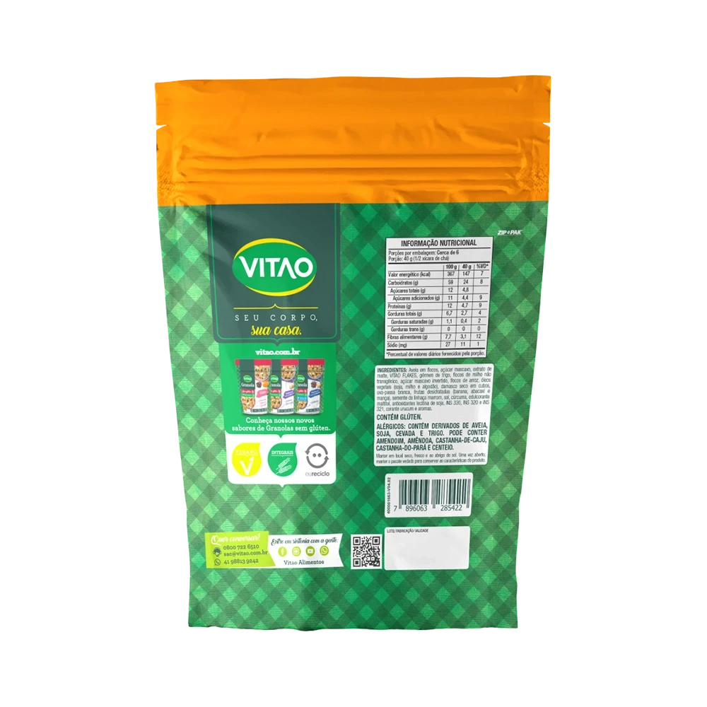 Aveia em flocos, açúcar mascavo invertido, açúcar mascavo, extrato de malte, Vitao Flakes, flocos de milho não transgênico, gérmen de trigo, flocos de arroz, óleos vegetais (soja, milho e algodão), uva-passa branca, damasco seco em cubos, frutas desidratadas (banana, abacaxi e manga), ameixa, semente de linhaça marrom, sal, cúrcuma, antioxidantes lecitina de soja, ácido cítrico, BHA e BHT, corante urucum e aromas.