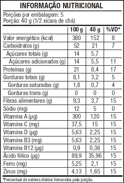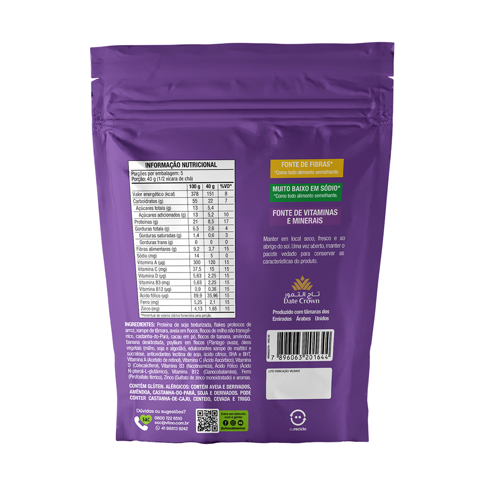 Proteína de soja texturizada, flakes proteicos de arroz, xarope de tâmara, aveia em flocos, flocos de milho não transgênico, castanha-do-Pará, cacau em pó, flocos de banana, amêndoa, banana desidratada, psyllium em flocos (Plantagoovata), óleos vegetais (milho, soja e algodão), edulcorantes xarope de maltitol e sucralose, antioxidantes lecitina de soja, ácido cítrico, BHA e BHT, Vitamina A (Acetato de retinol), Vitamina C (Ácido Ascórbico), Vitamina D (Colecalciferol), Vitamina B3 (Nicotinamida), Ácido Fólico (Ácido N-pteroil-L-glutâmico), Vitamina B12 (Cianocobalamina), Ferro (Pirofosfato férrico), Zinco (Sulfato de zinco monoidratado)e aromas.