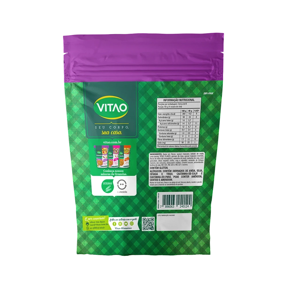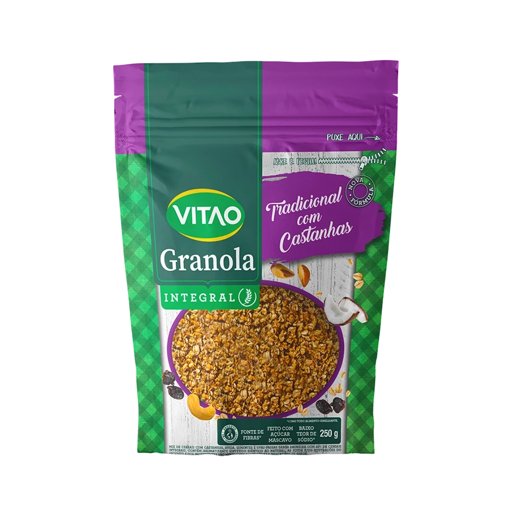 Experimente a Granola Tradicional da Vitao com iogurte, leite vegetal ou frutas frescas para um lanche delicioso e nutritivo. Também é perfeita como topping para smoothies, bolos e panquecas, adicionando crocância e uma dose extra de nutrientes, garantindo energia e sabor durante todo o seu dia.